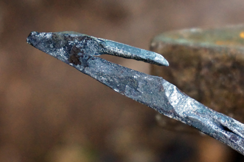 Fabrication expérimentale d'une armature de flèche en fer forgé : dégorgeage. © Photographie DM